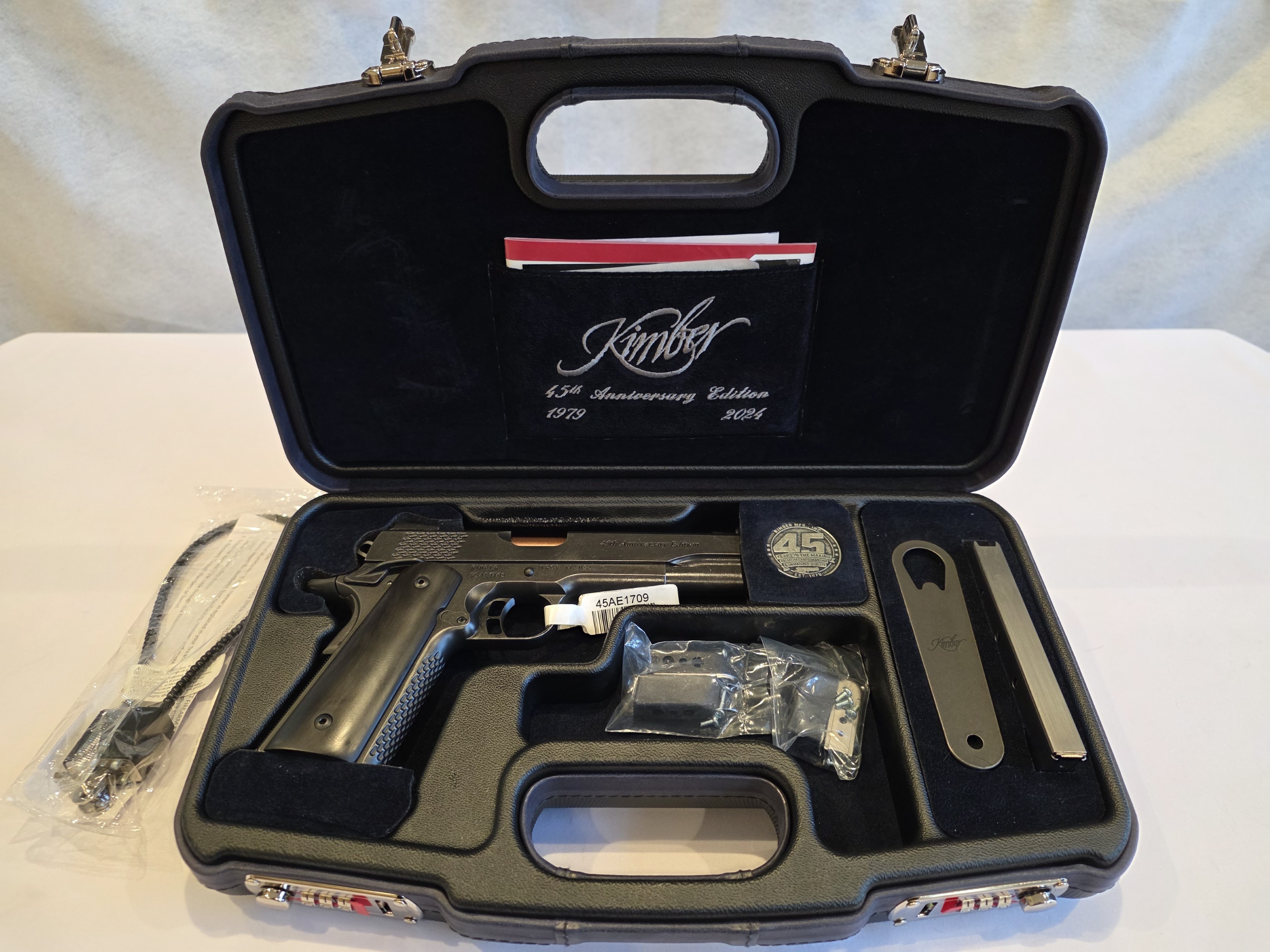 This is a beautiful gun which comes beautifully presented in a very upscale case. It's a Kimber so you know it's quality built. Comes with 2 mags, challenge coin, barrel wrench and gun lock. This is a nice collectible for anyone who enjoys a solid 1911 or is a Kimber fan.