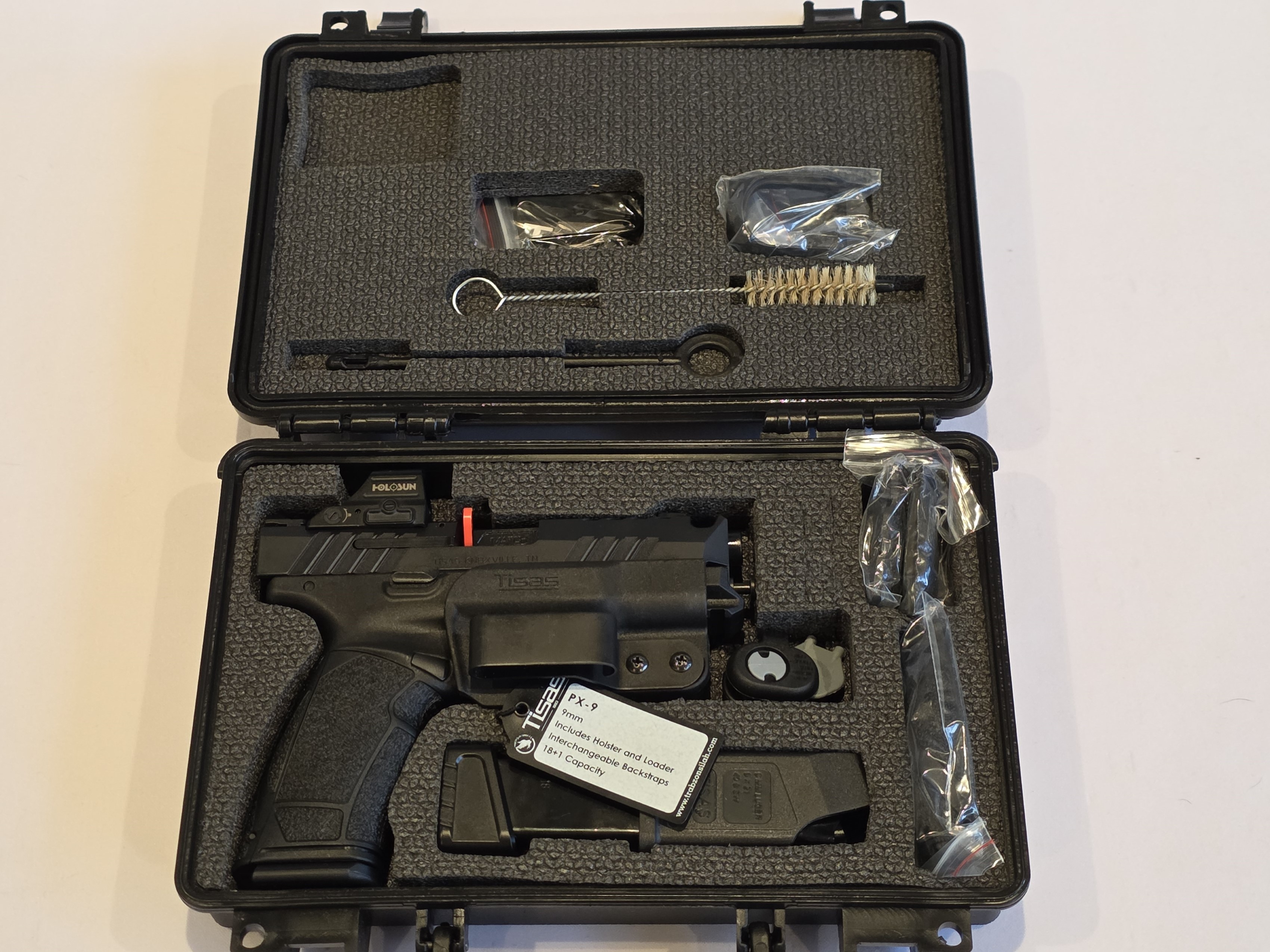 This gun is fantastic for the money. Comes with everything you need to get going. The holster is really slick. Trigger on this gun is fantastic (you can read or watch reviews and all of them call out the trigger as being surprisingly good for a gun in this price range). It also comes with not just backstrap options but side grip options as well so very customizable. Also has a flared magwell attachment. We topped it with a Holosun HE407C GR X2 which is included in the price.