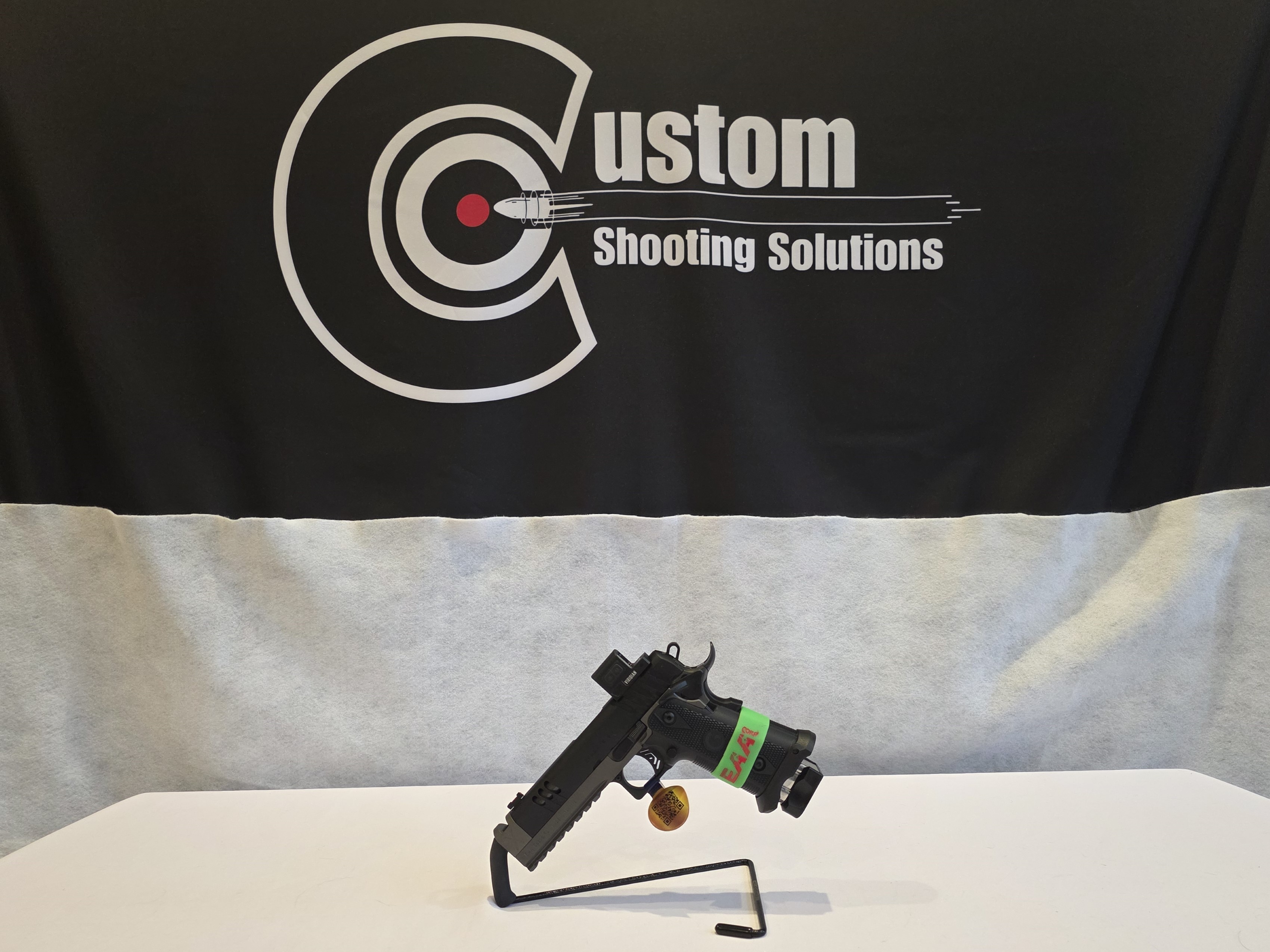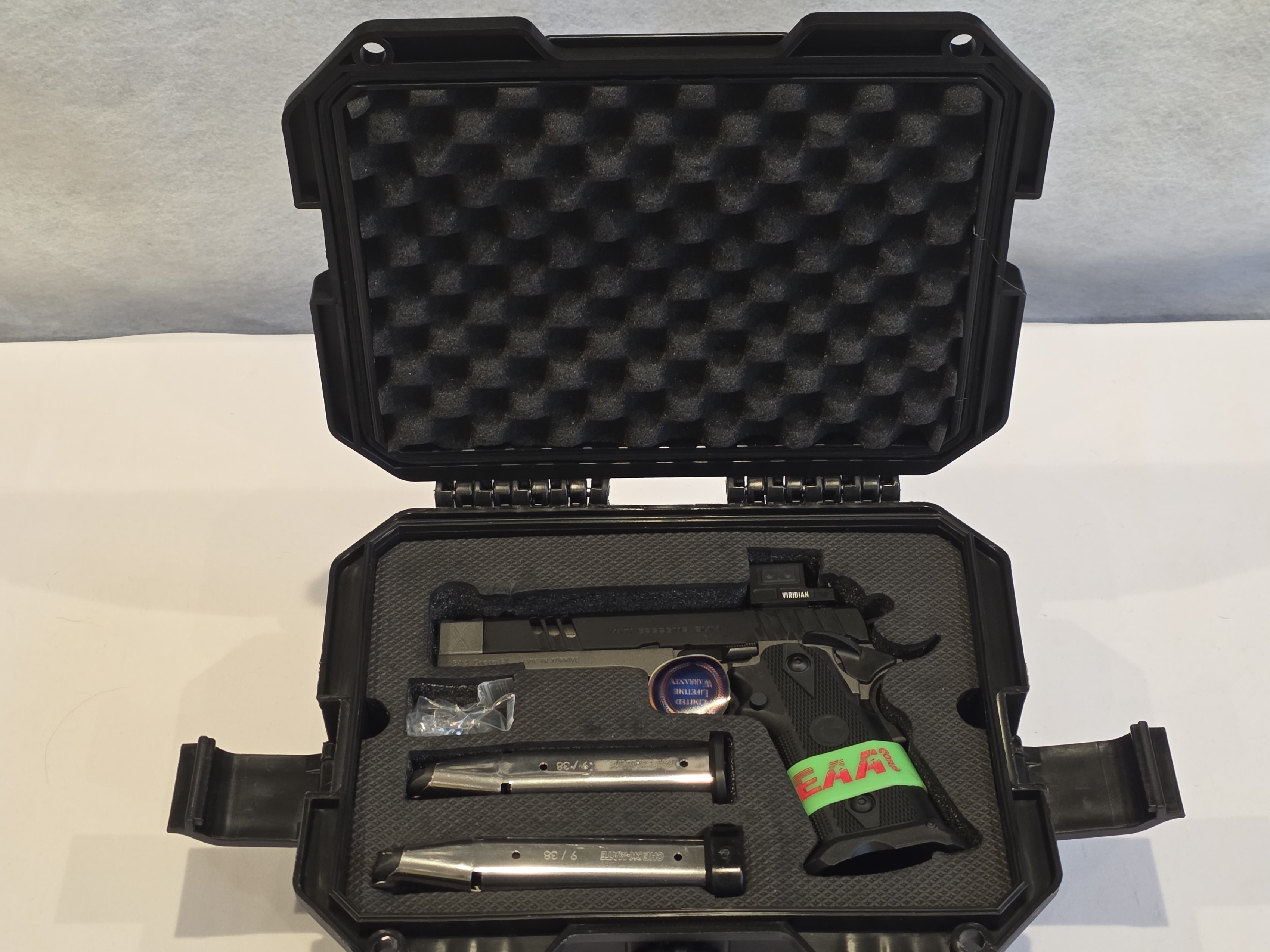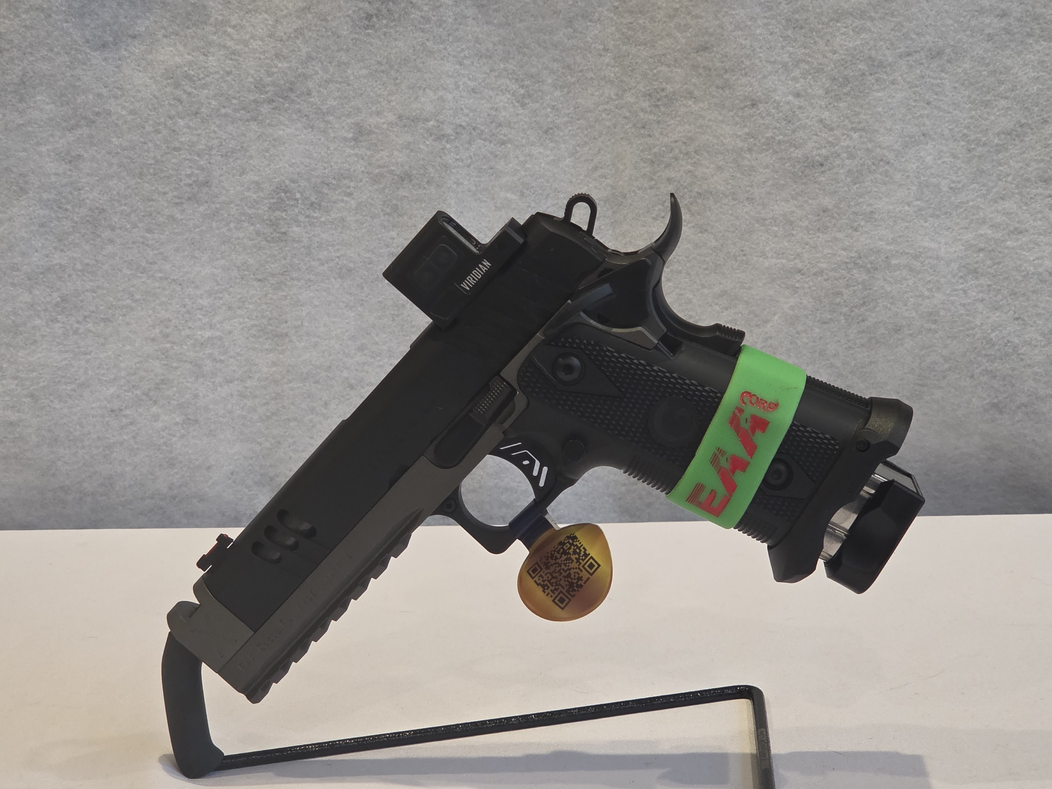 This is a sweet ass gun...fits great in the hand, looks fantastic, and has great reviews. Comes with a nice hard case, 2 mags and all kinds of swagger. Topped with a Viridian RFX42 Green Dot. Shoot us an e-mail or give us a call on this one!